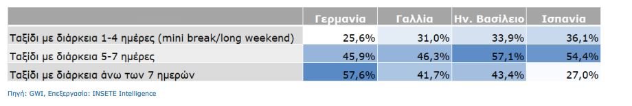 Πιο αναλυτικά, ταξίδι με διάρκεια άνω των 7 ημερών προτιμά το 57,6% των Γερμανών, το 41,7% των Γάλλων, το 43,4% των κατοίκων του Ην. Βασιλείου και το 27% των Ισπανών. Ακολουθεί το ταξίδι με διάρκεια 5-7 ημέρες το οποίο προτιμά το 45,9% των Γερμανών, το 46,3% των Γάλλων, το 57,1% των κατοίκων του Ην. Βασιλείου και το 54,4% των Ισπανών. Ταξίδι με διάρκεια 1-4 ημέρες (mini break/long weekend) προτιμά το 25,6% των Γερμανών, το 31% των Γάλλων, το 33,9% των κατοίκων του Ην. Βασιλείου και το 36,1% των Ισπανών.
