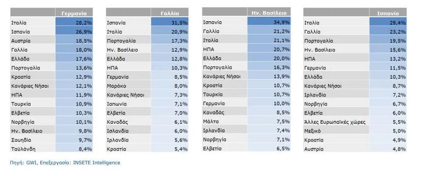 - Για τους Γερμανούς: Ιταλία (28,2%), Ισπανία (26,9%), Αυστρία (18,5%), Γαλλία (18%), Ελλάδα (17,6%). Να σημειωθεί ότι η Ιταλία και η Αυστρία είναι προορισμοί που ευνοούνται και με εύκολη οδική πρόσβαση από τη Γερμανία.