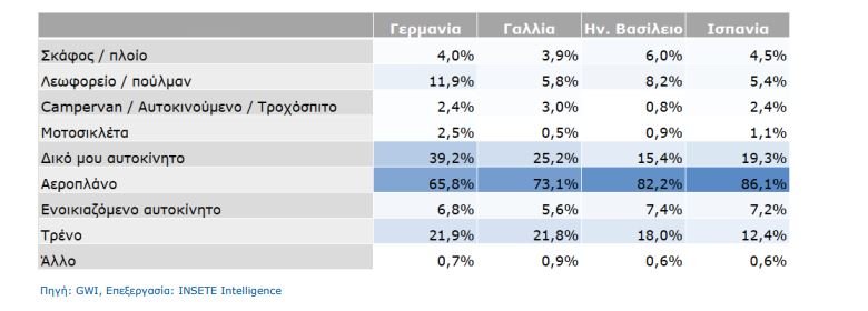 Πιο αναλυτικά, με αεροπλάνο σκοπεύει να ταξιδέψει προς τον προορισμό των διακοπών τους, το 65,8% των Γερμανών, το 73,1% των Γάλλων, το 82,2% των κατοίκων του Ην. Βασιλείου και το 86,1% των Ισπανών.