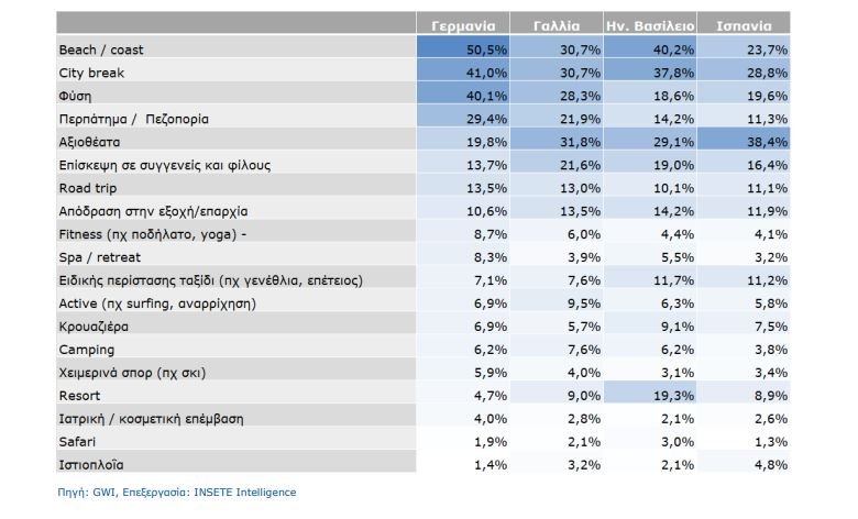 Ειδικότερα, τα ταξίδια για τη θάλασσα προτιμούν το 51% των Γερμανών, το 31% των Γάλλων, το 40% από το Ηνωμένο Βασίλειο και το 24% των Ισπανών. City Break προτιμούν το 41% των Γερμανών, το 31% των Γάλλων, το 38% από το Ην. Βασίλειο και το 29% των Ισπανών. Οι Γερμανοί δείχνουν μεγάλο ενδιαφέρον και για διακοπές στη Φύση (40%) και για Περπάτημα / Πεζοπορία ( 29%).