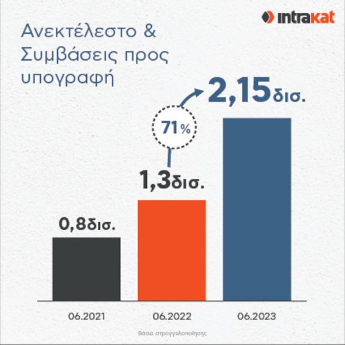 Σύμφωνα με τα οικονομικά αποτελέσματα για το πρώτο εξάμηνο του 2023, που δημοσιεύονται σήμερα, ο ενοποιημένος κύκλος εργασιών του ομίλου Intrakat διαμορφώθηκε στα 149 εκατ. ευρώ, σημειώνοντας αύξηση κατά 45% (έναντι 103 εκατ. ευρώ πέρυσι). Το ανεκτέλεστο (των υπογεγραμμένων και των προς συμβασιοποίηση έργων) διαμορφώθηκε σε 2,1 δισ. ευρώ, έναντι 1,3 δισ. ευρώ στις 30/06/22, αυξημένο κατά 71%.