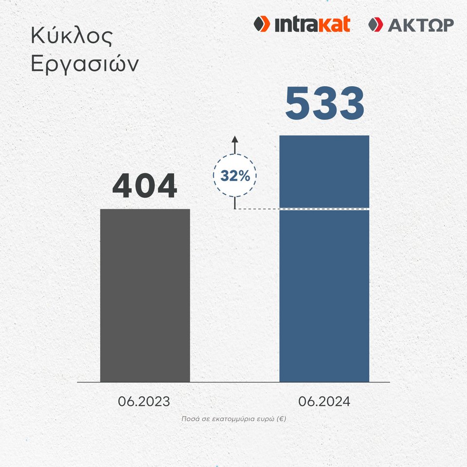 Ενοποιώντας την ΑΚΤΩΡ για ολόκληρο το πρώτο εξάμηνο του 2024, ο Όμιλος Intrakat κατέγραψε ξεκάθαρη αύξηση των μεγεθών του, σημαντική βελτίωση σε όλους τους κρίσιμους επιχειρηματικούς δείκτες και επιτάχυνση του ρυθμού παραγωγής των μεγάλων έργων υποδομών, επιβεβαιώνοντας όχι μόνο την ορθότητα και την επιτυχία της εξαγοράς της ΑΚΤΩΡ, αλλά και τη συνέπεια λόγων και πράξεων του Ομίλου.