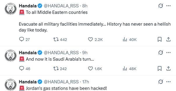 Η Handala (συχνά αποκαλούμενη «Handala Hack Team») εμφανίστηκε ως φιλοπαλαιστινιακή χακτιβιστική ταυτότητα στα τέλη του 2023 και αξιολογείται ως μία από τις πολλές διαδικτυακές περσόνες που διατηρούνται από τη Void Manticore, μια εταιρεία που συνδέεται με το MOIS. Στο τρέχον κλίμα κλιμάκωσης χρήζει στενής παρακολούθησης, καθώς είναι βελτιστοποιημένη για ψυχολογική πίεση και διατάραξη της φήμης: εισβολή σε συστήματα χαμηλού επιπέδου, διεξαγωγή δραστηριότητας hacking-and-leak και χρονισμός της δημοσίευσης κλεμμένου υλικού για μεγιστοποίηση της πίεσης.