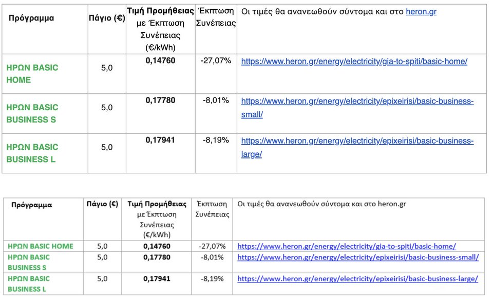 Ο πάροχος, θυγατρική εταιρεία του Ομίλου ΓΕΚ ΤΕΡΝΑ, διατηρεί τις τιμές αμετάβλητες, ίδιες με τις χαμηλές τιμές του Οκτωβρίου και του Νοεμβρίου. Ως εκ τούτου, το «πράσινο τιμολόγιο» του Ήρων αναμένεται να παραμείνει από τα χαμηλότερα της αγοράς: