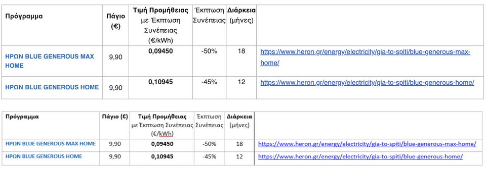 Οι πολύ ανταγωνιστικές τιμές των σταθερών οικιακών προγραμμάτων HΡΩΝ ΒLUE GENEROUS, με το 18μηνο συμβόλαιο ΗΡΩΝ BLUE GENEROUS MAX να παραμένει κάτω από τα 9,5 λεπτά την κιλοβατώρα, εξασφαλίζοντας χαμηλή & σταθερή τιμή αυτόν, αλλά και τον επόμενο χειμώνα.