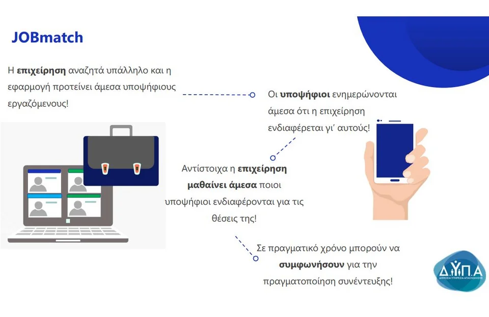 Η πλατφόρμα jobmatch.dypa.gov.gr απευθύνεται στις επιχειρήσεις και η εφαρμογή JOBmatch σε όσους αναζητούν εργασία.
