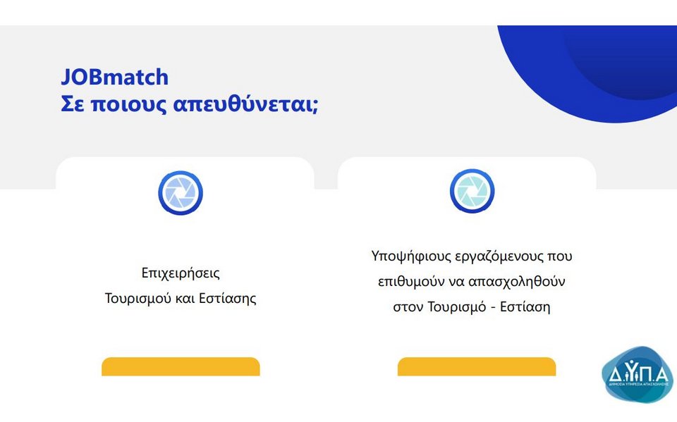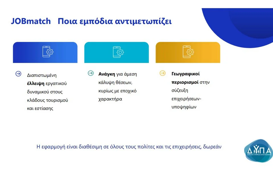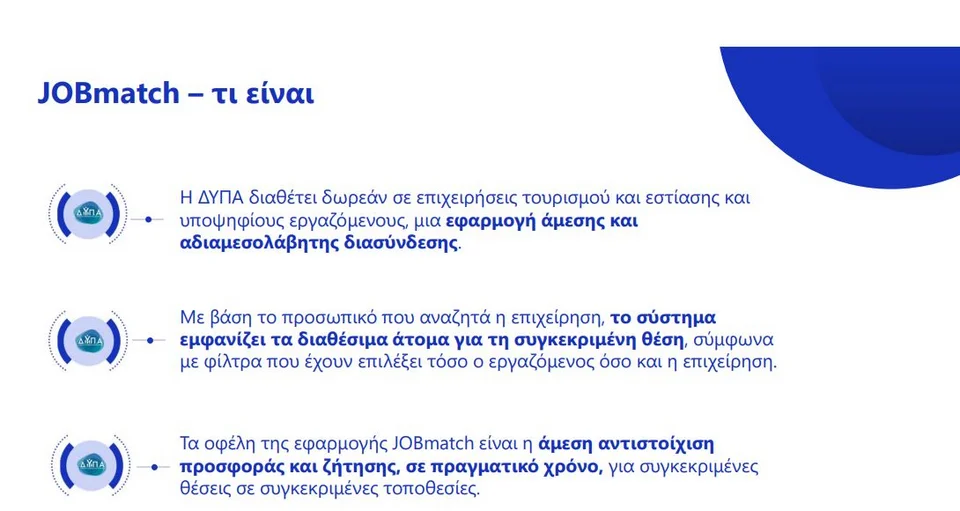 Ενεργοποιήθηκε σήμερα η νέα δωρεάν εφαρμογή JOBmatch της ΔΥΠΑ για την άμεση διασύνδεση των επιχειρήσεων τουρισμού και εστίασης με όσους ψάχνουν για δουλειά σε αντίστοιχες ειδικότητες.