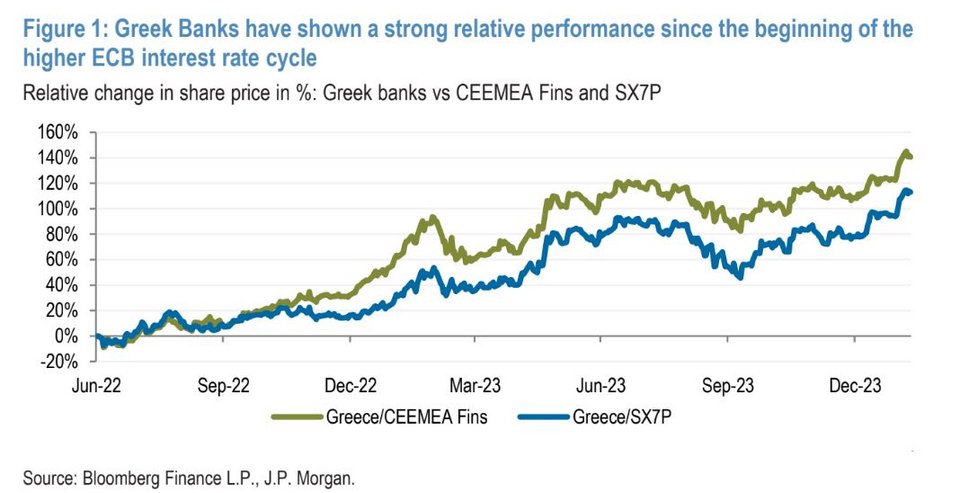 Οι ελληνικές τραπεζικές μετοχές έχουν παρουσιάσει ισχυρή απόδοση – περίπου 100% από τον Ιούνιο του 2022, έναντι περίπου 30% για τον SX7P (Δείκτης Ευρωπαϊκών Τραπεζών), σύμφωνα με έκθεση της JP Morgan.
