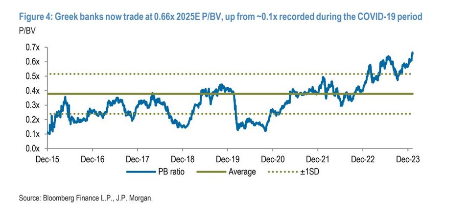 - Οι ελληνικές τράπεζες εμφανίζονται περίπου 40% φθηνότερες από τις αντίστοιχες της CEEMEA-Κεντρική και Ανατολή Ευρώπη, Μέση Ανατολή και Αφρική- το οποίο η JP Morgan θεωρεί σημαντικό παράγοντα τεχνικής υποστήριξης για τον κλάδο σε σχέση με τις αποτιμήσεις των ευρωπαϊκών τραπεζών μεσοπρόθεσμα.