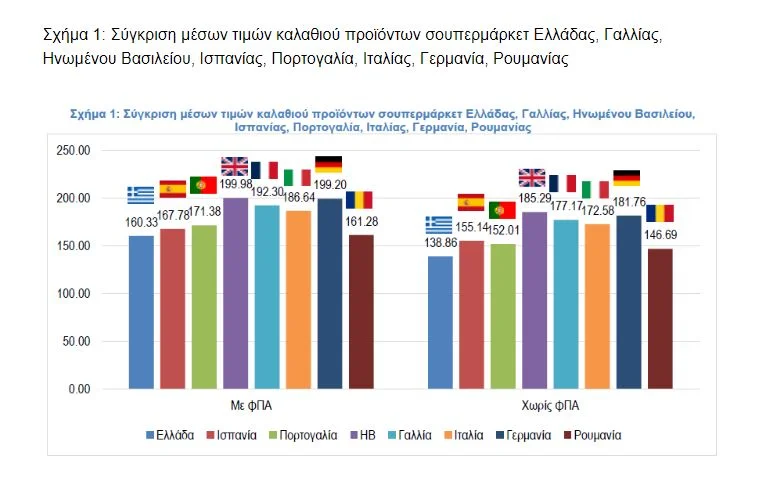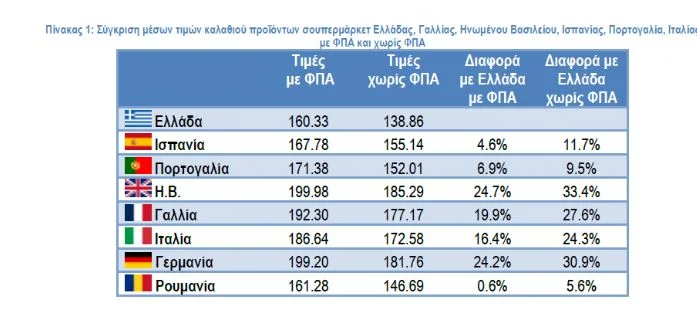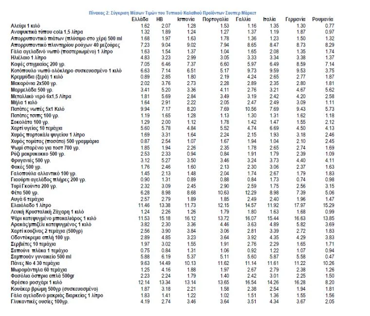 Η σύγκριση των μέσων τιμών των καλαθιών (πίνακας 1) δείχνει ότι και οι πέντε χώρες έχουν σημαντικά ακριβότερο μέσο καλάθι από την Ελλάδα, 24% η Γερμανία, 20% η Γαλλία, 25% το Ηνωμένο Βασίλειο, 16% η Ιταλία, 7% η Πορτογαλία, ενώ η Ισπανία και η Ρουμανία είναι αρκετά κοντά με την Ελλάδα αλλά ακριβότερες κατά 5% και 11%, αντίστοιχα.