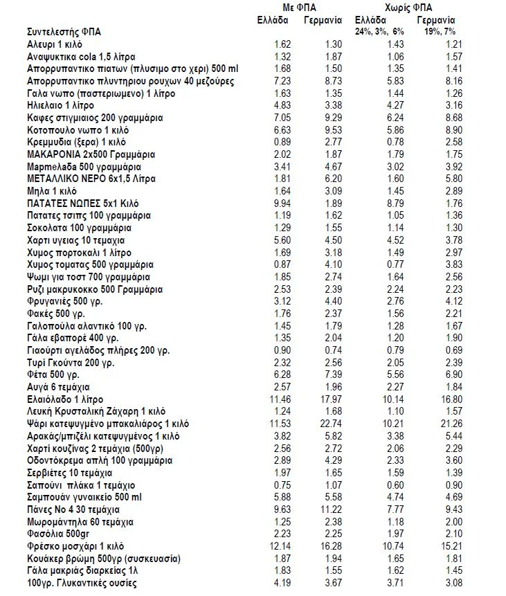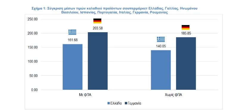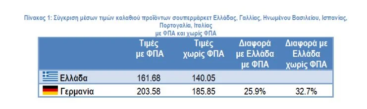 Η σύγκριση των μέσων τιμών των καλαθιών (πίνακας 1) δείχνει ότι η Γερμανία έχει ακριβότερο καλάθι κατά 26% Η εικόνα των αποτελεσμάτων αλλάζει σημαντικά όταν αφαιρέσουμε τον αναλογούντα ΦΠΑ ανά χώρα για να γίνουν αντιληπτές τις πραγματικές τιμές των προϊόντων σουπερμάρκετ. Η σύγκριση των καλαθιών σε αυτή την περίπτωση (σχήμα 1 και πίνακας 1) η Γερμανία έχει ακριβότερο καλάθι κατά 33%. Αυτό είναι αποτέλεσμα της διαφοράς που έχει ο χαμηλός ΦΠΑ ανά χώρα (πρόκειται για τον ΦΠΑ που αναφέρεται σε τρόφιμα και ποτά). Στην Ελλάδα αυτός ο ΦΠΑ είναι 13% ενώ στην Γερμανία (7%)