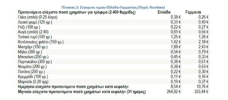 Σε αντίστοιχα συμπεράσματα καταλήγει και η ανάλυση στοιχείων του Numbeo (το numbeo είναι crowd-sourced global database για τιμές καταναλωτή παγκοσμίως, με στοιχεία από το 2009), τον Ιούνιο 2024, με βάση στοιχεία των τελευταίων 12 μηνών, τα οποία αφορούν όλα τα σημεία πώλησης και αφορούν το ελάχιστο ποσό χρημάτων που πρέπει να δαπανήσει κάποιος στις δύο χώρες προκειμένου να καλύψει τις ανάγκες θερμίδων, και σε αυτή την περίπτωση η Γερμανία είναι ακριβότερη κατά 26% σε σχέση με την Ελλάδα με 333 ευρώ έναντι 264 ευρώ στην Ελλάδα.