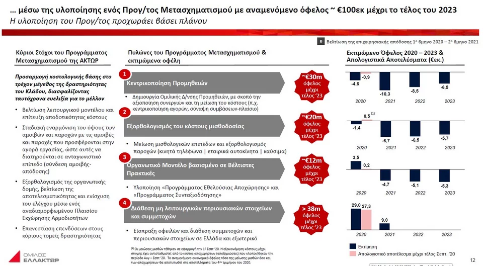 Η ΑΚΤΩΡ εφαρμόζει επί του παρόντος ένα πρόγραμμα μετασχηματισμού, το οποίο αναμένεται να αποφέρει οφέλη της τάξεως των €100 εκατ. έως το 2023. Η υλοποίηση του προγράμματος προχωράει βάσει του χρονοδιαγράμματος και σε αυτή τη φάση εστιάζει στην κεντρικοποίηση των Προμηθειών σε επίπεδο Ομίλου, στον εξορθολογισμό των δαπανών προσωπικού, μέσω της ευθυγράμμισης του επιπέδου των αποδοχών και παροχών με την αγορά, συνδέοντας την αμοιβή με την απόδοση, στη βελτιστοποίηση της οργανωτικής δομής και του μεγέθους της μέσω Προγράμματος Εθελουσίας Εξόδου και Συνταξιοδότησης, και διάθεση μη λειτουργικών περιουσιακών στοιχείων και συμμετοχών, που έχουν αποφέρει εισπράξεις της τάξεως των €27 εκατ. μέχρι το τέλος Σεπτεμβρίου 2020.