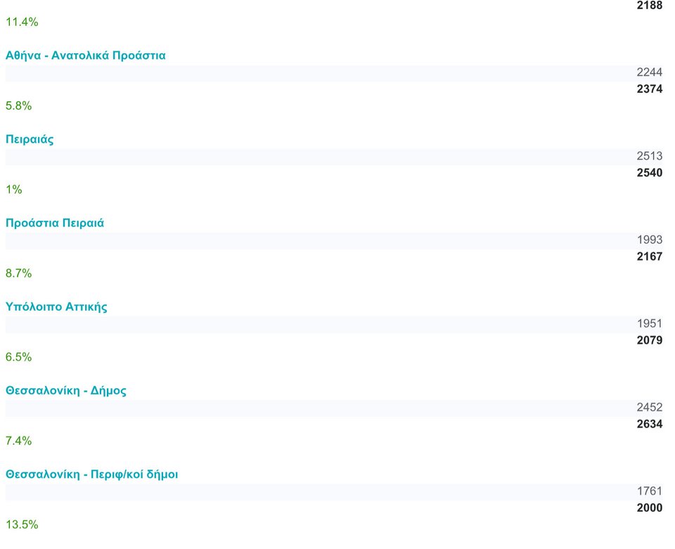 Ακόμα πιο ενδιαφέρον είναι το ότι η ταχύτητα αύξησης των τιμών δείχνει να μετατοπίζεται από τα μεγάλα αστικά κέντρα, στην περιφέρεια, όπου τα περιθώρια αυξήσεων είναι ακόμα μεγάλα. Σύμφωνα με τα στοιχεία του Spitogatos, στην Αθήνα οι τιμές “έτρεξαν” με 8%, στη Θεσσαλονίκη με 12,5% και στην υπόλοιπη Ελλάδα με 11,4%. Ειδικά όσον αφορά στο Λεκανοπέδιο της Αττικής, από περιοχή σε περιοχή οι αυξήσεις έχουν μεγάλες διακυμάνσεις. Για παράδειγμα, στο κέντρο της Αθήνας οι αυξήσεις είναι της τάξης του 9,4%, ενώ στον Πειραιά είναι μόλις 1%. Αξιοσημείωτο πως ακόμα και στις περιοχές, που χαρακτηρίζονταν πιο “φιλικές” για την τσέπη, όπως τα Δυτικά Προάστια, οι τιμές “τρέχουν” με 11,4%!