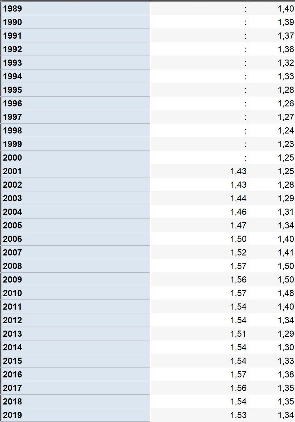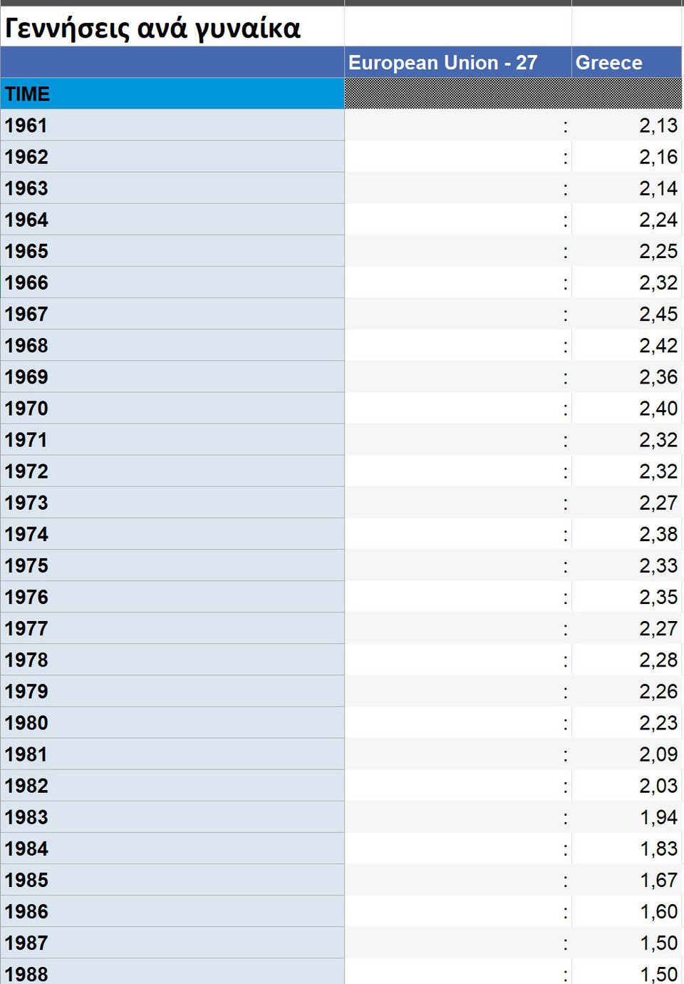 Πού βρίσκεται η Ελλάδα; Τη δεκαετία του 1960 το ποσοστό γονιμότητας έφτασε μέχρι το 2,45, ωστόσο μπαίνοντας στη δεκαετία του 1980 η αλλαγή του κοινωνικού μοντέλου έφερε και πτώση των γεννήσεων. Είναι ενδεικτικό ότι μπαίνοντας στη δεκαετία του 1990 το ποσοστό γονιμότητας είχε συρρικνωθεί στο 1,39 με τάσεις πτωτικές. Τα πράγματα έδειξαν να βελτιώνονται μπαίνοντας στη δεκαετία του 2000, με την είσοδο της Ελλάδας στο Ευρώ και τη βελτίωση του ονομαστικού κατά κεφαλήν εισοδήματος, με το δείκτη γονιμότητας να βελτιώνεται στο 1,50 λίγο πριν μπούμε στο τούνελ της οικονομικής κρίσης. Από εκεί και πέρα η “βουτιά” είναι συνεχής, για να φτάσουμε στο 1,24 το 2024.