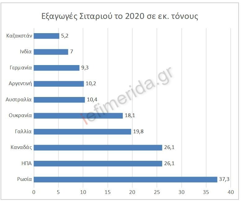 Στο σχήμα, που περιλαμβάνεται στη μελέτη του Πολυτεχνείου Κρήτης, φαίνονται οι κυριότερες εξαγωγικές χώρες σιταριού. Εκτός από το πετρέλαιο, το φυσικό αέριο και πολλά πολύτιμα μέταλλα, η Ρωσία είναι επίσης σημαντικός παραγωγός σιταριού. Σύμφωνα με τον FAO, η Ρωσία παρήγαγε 86 εκατομμύρια τόνους σιτηρών το 2020, από τα οποία εξήγαγε τα 37,3 εκατ. τόνους. Πρώτη στην παραγωγή είναι η Κίνα και στη συνέχεια η Ινδία, ωστόσο δεν ήταν σημαντικοί εξαγωγείς σιταριού.