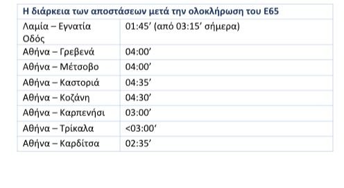 Ενδεικτικά αναφέρουμε ότι συνολικά το ταξίδι από Λαμία έως και Εγνατία Οδό, μέσω του Ε65 θα διαρκεί 1 ώρα και 45 λεπτά, από 3 ώρες και 15 λεπτά σήμερα.