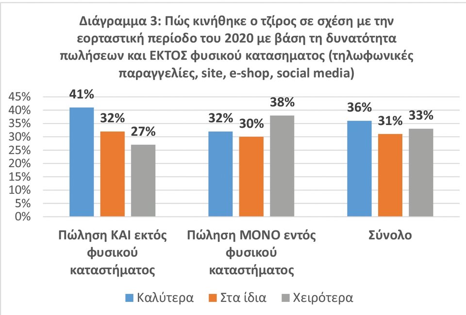 Ειδικότερα, το 41% των επιχειρήσεων λιανικού εμπορίου που χρησιμοποίησαν και το ηλεκτρονικό κανάλι πωλήσεων, είδαν τον τζίρο τους να αυξάνεται και μόλις το 27% είδε πτώση. Σημειωτέον ότι από αυτές τις επιχειρήσεις, το 32% απέκτησε τη δυνατότητα να πραγματοποιεί πωλήσεις εκτός φυσικών καταστημάτων κατά τη διάρκεια της πανδημίας, κάτι που σημαίνει ότι όποιοι «επένδυσαν» σε αυτήν τη δύσκολη περίοδο και προσαρμόστηκαν γρήγορα στα νέα δεδομένα, βγήκαν κερδισμένοι και απέκτησαν συγκριτικό πλεονέκτημα για τη δύσκολη συνέχεια.