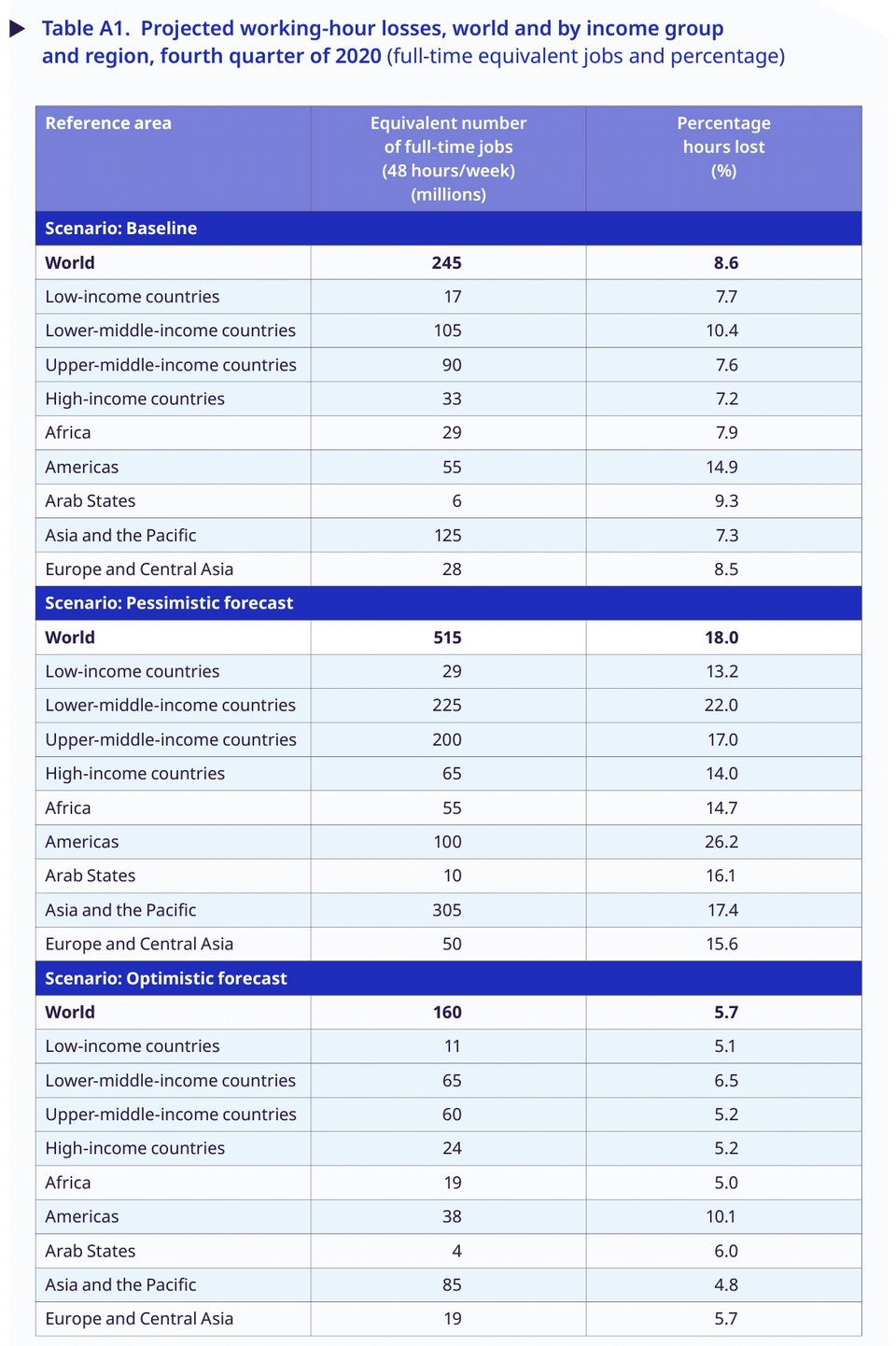 Η τελευταία μελέτη του ILO για τις επιπτώσεις στην απασχόληση από την επέλαση της πανδημίας είναι πραγματικά αποκαλυπτική, καθώς βασίζεται σε επιδείνωση των προηγούμενων εκτιμήσεων. Οι νέοι υπολογισμοί δείχνουν ότι στο δεύτερο τρίμηνο χάθηκαν παγκοσμίως 495 εκατομμύρια θέσεις πλήρους απασχόλησης αντί των 400 εκατομμυρίων που προέβλεπε η αντίστοιχη μελέτη του Ιουνίου, ενώ για το τρίτο τρίμηνο οι απώλειες υπολογίζονται σε 345 εκατομμύρια και για το τέταρτο τρίμηνο σε 245 εκατομμύρια.