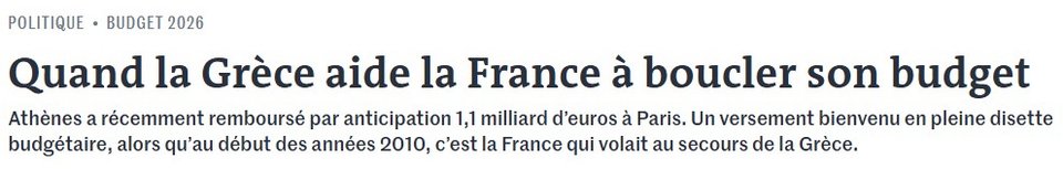 «Αυτός είναι ένας τρόπος για να απελευθερωθεί η Ελλάδα από τους πιστωτές της και να ανακτήσει την αξιοπιστία της στον χρηματοπιστωτικό κόσμο. Το αποτέλεσμα είναι σαφές: Από το καλοκαίρι του 2025 η Ελλάδα θεωρείται ασφαλέστερος δανειολήπτης από τη Γαλλία στις αγορές. Οι επενδυτές της προσφέρουν ελαφρώς χαμηλότερα επιτόκια από το γαλλικό υπουργείο Οικονομικών», σημειώνεται στο σχετικό δημοσίευμα με τίτλο «Όταν η Ελλάδα βοηθά τη Γαλλία να κλείσει τον Προϋπολογισμό της».