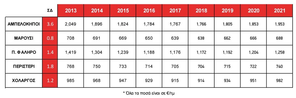 Οι αξίες των οικοπέδων εξακολουθούν να βρίσκονται σε χαμηλότερα επίπεδα από το 2013 αφού μεταξύ του 2ου τριμήνου 2021 και του 2ου τριμήνου 2013 καταγράφεται μείωση των ζητούμενων τιμών πώλησης σε ένα μέσο όρο της τάξης 4,57% και για τις πέντε υπό εξέταση αγορές. Ωστόσο, η τάση της 9ετίας δείχνει καθαρά να εισερχόμαστε σε ανοδική φάση του κύκλου.
