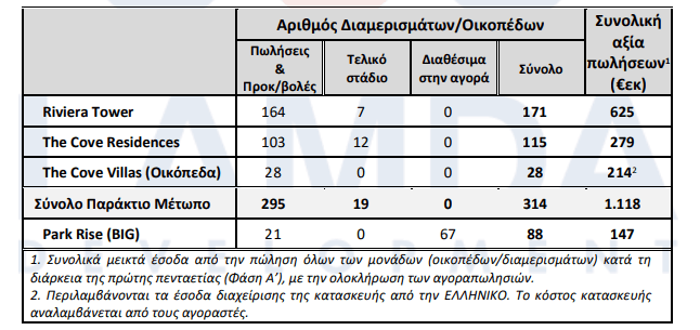 • The Cove Villas: έχουν εκδοθεί οι οικοδομικές άδειες για 3 οικόπεδα ενώ για επιπλέον 10 οικόπεδα είναι σε εξέλιξη η διαδικασία έκδοσης οικοδομικής άδειας. Περαιτέρω, έχουν ολοκληρωθεί σχεδόν όλες οι απαιτούμενες κατεδαφίσεις.