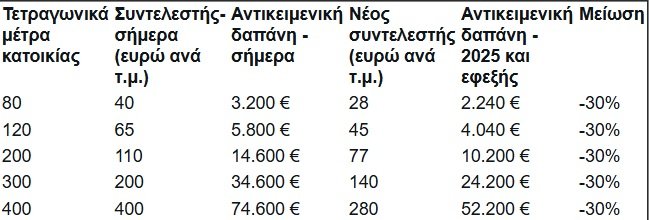 κατά 30% για κατοικίες σε περιοχές με Τιμή Ζώνης κάτω από 2.800 ευρώ ανά τετραγωνικό. Για σπίτια έως 80 τ.μ., ο συντελεστής μειώνεται από 40 σε 28 ευρώ ανά τ.μ. και η αντίστοιχη μείωση της αντικειμενικής δαπάνης από 3.200 ευρώ σε 2.240 ευρώ (-30%). Ενώ για κατοικίες 120 τ.μ., η αντικειμενική δαπάνη μειώνεται από 5.800 σε 4.040 ευρώ.