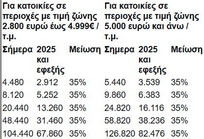 για κατοικίες σε περιοχές με τιμές ζώνης από 2.800 έως 4.999 ευρώ/τ.μ. το τεκμαρτό θα προσαυξάνεται πλέον κατά 30% και όχι κατά 40%. Έτσι η αντικειμενική δαπάνη μειώνεται συνολικά κατά 35%