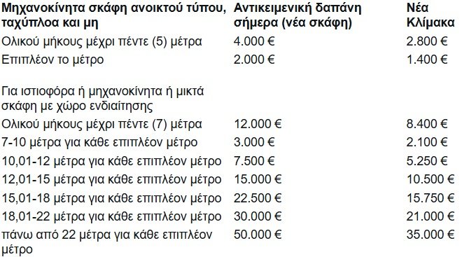 Για τα σκάφη σήμερα η τεκμαρτή δαπάνη από κάθε σκάφος μειώνεται ανάλογα με την παλαιότητά του κατά 15% αν έχουν παρέλθει πάνω από 5 έτη από το έτος που νηολογήθηκε για πρώτη φορά, ή και 30% αν έχουν παρέλθει 10 έτη. Με το νέο καθεστώς, μειώνεται κατά 30% η τεκμαρτή δαπάνη και για τα νεότερα σκάφη, καθώς οι δαπάνες συντήρησης δεν είναι υψηλότερες στα νεότερα