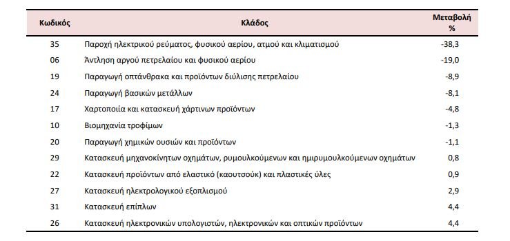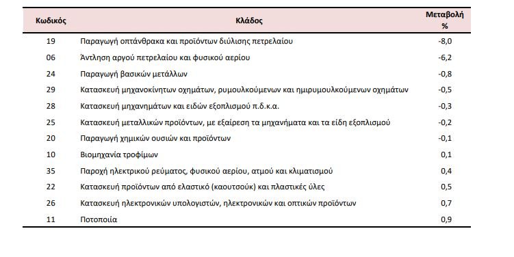 Στη μείωση του Γενικού Δείκτη Τιμών Εισαγωγών (σύνολο αγοράς) κατά 2,7%, συνέβαλαν κυρίως οι μεταβολές των δεικτών των διψήφιων κλάδων της ταξινόμησης NACE , ως εξής: