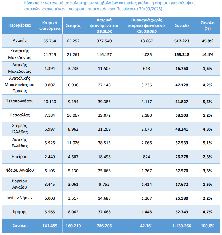 Το κερασάκι στην τούρτα είναι η γεωγραφική κατανομή των ασφαλιστηρίων συμβολαίων έναντι φυσικών καταστροφών. Σχεδόν τα μισά αφορούν στην Αττική, ενώ σε περιοχές που έχουν δεχθεί αλλεπάλληλα πλήγματα, όπως π.χ. η Θεσσαλία, η κάλυψη μόλις και μετά βίας φτάνει το 5%.
