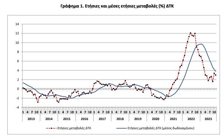 Ο μέσος ΔΤΚ του δωδεκαμήνου Δεκεμβρίου 2022 - Νοεμβρίου 2023, σε σύγκριση με τον αντίστοιχο Δείκτη του δωδεκαμήνου Δεκεμβρίου 2021 - Νοεμβρίου 2022, παρουσίασε αύξηση 3,8%, έναντι αύξησης 9,5% που σημειώθηκε κατά την αντίστοιχη σύγκριση του δωδεκαμήνου Δεκεμβρίου 2021 - Νοεμβρίου 2022 με το δωδεκάμηνο Δεκεμβρίου 2020 - Νοεμβρίου 2021.