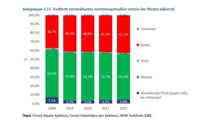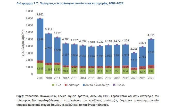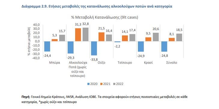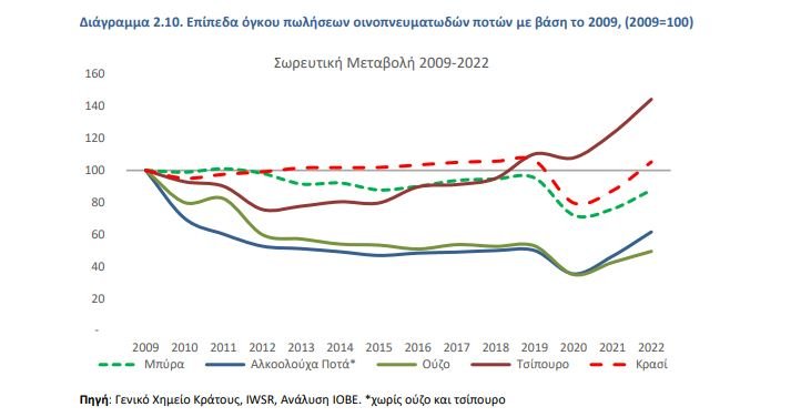Παρά τις μεγάλες ποσοστιαίες μεταβολές της περιόδου 2021-2022 στα αλκοολούχα ποτά, οι πωλήσεις παραμένουν πολύ χαμηλότερα σε σύγκριση με το 2009. Συγκεκριμένα, ανάμεσα σε όλες τις κατηγορίες των οινοπνευματωδών ποτών, το κρασί διατήρησε σε όλη σχεδόν την εξεταζόμενη περίοδο τα επίπεδα κατανάλωσης που είχαν καταγραφεί το 2009, με εξαίρεση την πανδημία, αλλά με επαναφορά το 2022, ενώ μετά το 2019 η κατανάλωση τσίπουρου βρίσκεται πάνω από τα επίπεδα του 2009. Η μπύρα παρουσιάζει την ίδια τάση με το κρασί, παραμένοντας όμως σε χαμηλότερα επίπεδα από τα προ κρίσης (2008) επίπεδα.