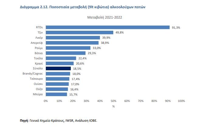 Συνολικά, στα λευκά ποτά (τζιν, βότκα, ρούμι, τεκίλα), αυξήθηκε σημαντικά η κατανάλωση το 2022 συγκριτικά με το 2021, ενώ σχετικά μικρότερες αυξήσεις καταγράφονται στο τσίπουρο, το ούζο, το ουίσκι αλλά και στη μπύρα.