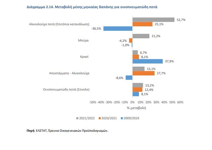 Τέλος, με βάση τα στοιχεία της έρευνας οικογενειακών προϋπολογισμών της ΕΛΣΤΑΤ, η μέση δαπάνη των νοικοκυριών για την αγορά οινοπνευματωδών ποτών αυξήθηκε κατά 13,2% συνολικά το 2022, ενώ την περίοδο 2009-2019 είχε καταγραφεί αύξηση της κατανάλωσης κατά 8,1%. Στο κρασί η μέση δαπάνη συνεχίζει και αυξάνεται, με ενίσχυση κατά 6,7% το 2022.