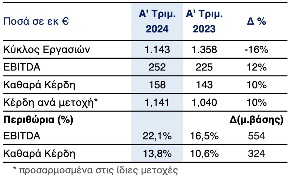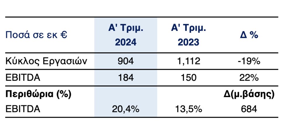 Όπως αναμενόταν, ο κύκλος εργασιών διαμορφώθηκε αισθητά χαμηλότερα (-16%) , λόγω της αισθητής αποκλιμάκωσης των τιμών Φ.Α., Ηλεκτρικής Ενέργειας αλλά και των μετάλλων.