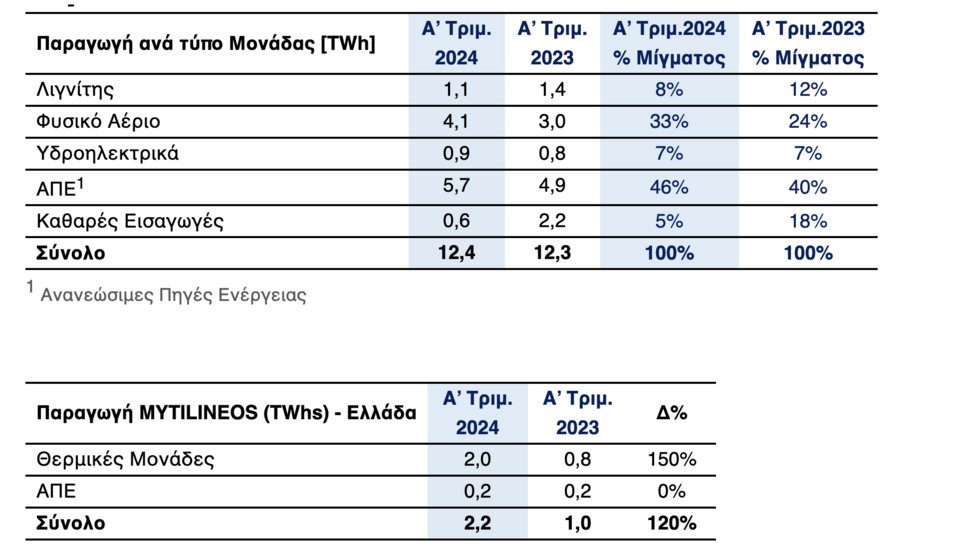 Η συνολική παραγωγή της MYTILINEOS, εντός Ελλάδος, τόσο από τις θερμικές, όσο και από τις ανανεώσιμες μονάδες της Εταιρείας ανήλθε σε 2,2 TWh, ποσότητα που αντιστοιχεί στο 18% της συνολικής ζήτησης. Αναφορικά με την παραγωγή ηλεκτρικής ενέργειας από θερμικές μονάδες, οι τρείς σταθμοί συνδυασμένου κύκλου (CCGTs) και ο ένας σταθμός συμπαραγωγής ηλεκτρισμού-θερμότητας υψηλής αποδοτικότητας (CHP), παρήγαγαν αθροιστικά ~2 TWh. Η ποσότητα αυτή αντιπροσωπεύει περίπου 17% της συνολικής ζήτησης στο διασυνδεδεμένο σύστημα και το 49% της παραγωγής από μονάδες φυσικού αερίου, από 27% που ήταν στο αντίστοιχο διάστημα του προηγούμενου έτους.
