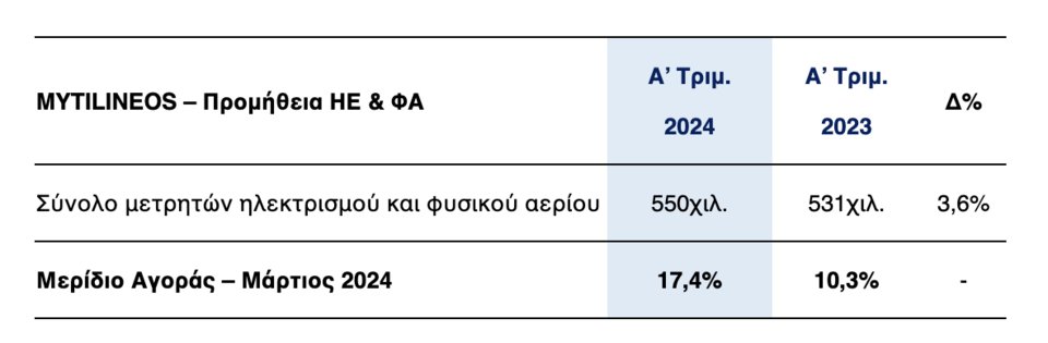 Ως εκ τούτου, στο τέλος του Α’ τριμήνου του 2024, η MYTILINEOS εκπροσωπεί πλέον 550 χιλιάδες μετρητές ηλεκτρισμού και φυσικού αέριου, ενώ το μερίδιό της στην αγορά ηλεκτρισμού τον Μάρτιο του 2024 ξεπέρασε το 17% (μερίδια ΕΧΕ). Το επόμενο διάστημα, η MYTILINEOS στοχεύει να ξεπεράσει το 25% της ελληνικής κατανάλωσης, συνυπολογίζοντας και την εκπροσώπηση του Αλουμινίου της Ελλάδος, δημιουργώντας ένα ολοκληρωμένο «πράσινο» utility με διεθνή παρουσία. Έχοντας αξιοποιήσει την καθετοποίηση της λειτουργίας της Εταιρείας στον Κλάδο Ενέργειας, η MYTILINEOS εδραιώνεται πλέον ως ένας ολοκληρωμένος πάροχος ενέργειας της νέας εποχής.