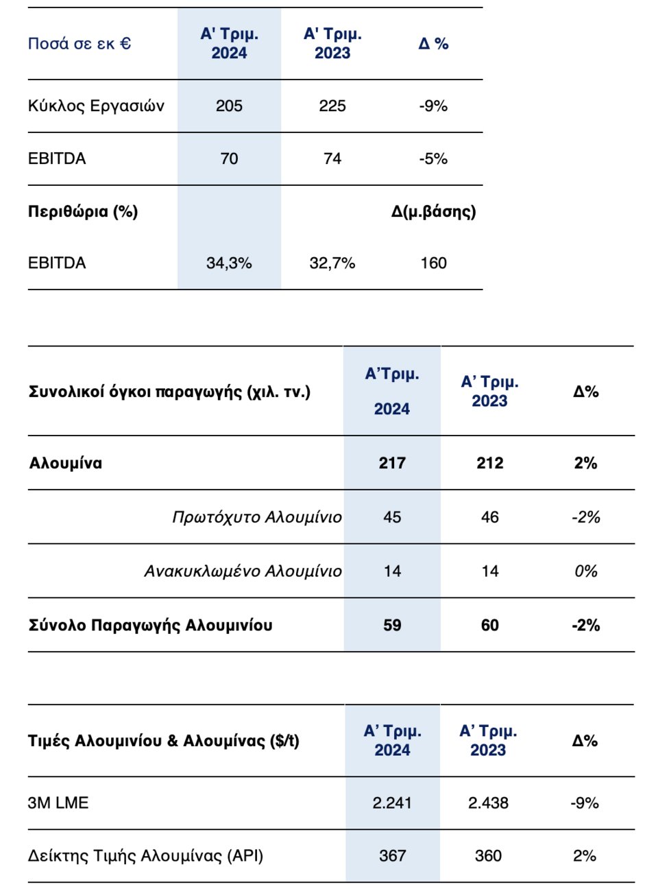 Τα premia της κολόνας αλουμινίου αποκλιμακώθηκαν περαιτέρω στο Α’ τρίμηνο του 2024 με τη μέση τιμή να βρίσκεται στα επίπεδα των $400/τόνο, από >$600/τόνο την αντίστοιχη περίοδο του 2023. Παρά την υποχώρησή τους, τα premia της κολόνας αλουμινίου κινούνται και πάλι ανοδικά, κυρίως λόγω της μειωμένης ευρωπαϊκής παραγωγής αλουμινίου, η οποία παραμένει μια σημαντικά ελλειμματική αγορά, με τις περισσότερες ανάγκες της να καλύπτονται από εισαγωγές από τρίτες χώρες, συμπεριλαμβανομένης της Ρωσίας και της Μέσης Ανατολής, οι οποίες πλέον αρχίζουν να τίθενται εν αμφιβόλω.