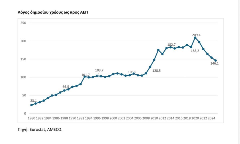 Στο τέλος του 2025 όμως, ο λόγος του δημόσιου χρέους προς το ΑΕΠ είχε περιοριστεί στο 146,1%, που συνιστά μείωση σχεδόν 67 μονάδων σε διάστημα μόλις τεσσάρων ετών, μολονότι την περίοδο εκείνη η οικονομία δοκιμάστηκε από τη διπλή ενεργειακή και εφοδιαστική κρίση που προκάλεσε η εισβολή της Ρωσίας στην Ουκρανία.
