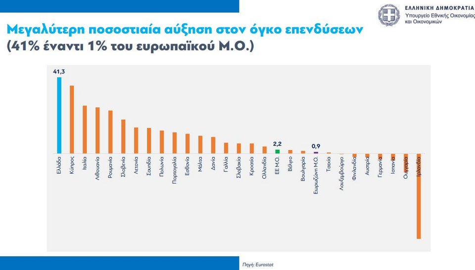 - Μεταξύ 2019 και 2023 η Ελλάδα παρουσίασε τη μεγαλύτερη ποσοστιαία αύξηση των επενδύσεων στην ΕΕ, με ποσοστό 41,3% έναντι 1% που ήταν ο μέσος όρος της ευρωζώνης.