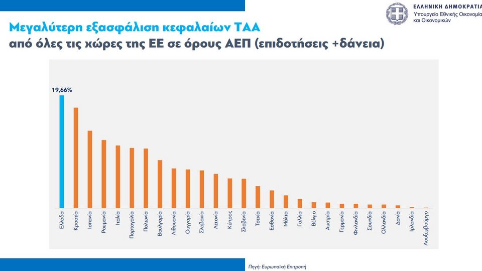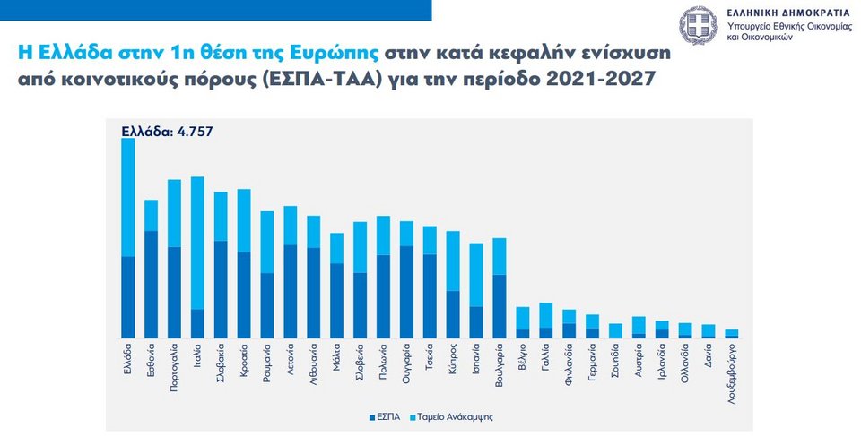 - Συνδυαστικά, από το ΕΣΠΑ 2021-2027 και το Ταμείο Ανάκαμψης η Ελλάδα εξασφάλισε τους περισσότερους πόρους μεταξύ των «27» σε σχέση με τον πληθυσμό. Αντίστοιχα, οι διαθέσιμοι πόροι από το Ταμείο Ανάκαμψης (δάνεια και επιδοτήσεις) για τη χώρα μας διαμορφώνονται στο 19,66% του ΑΕΠ, ποσοστό που είναι το υψηλότερο μεταξύ των «27».