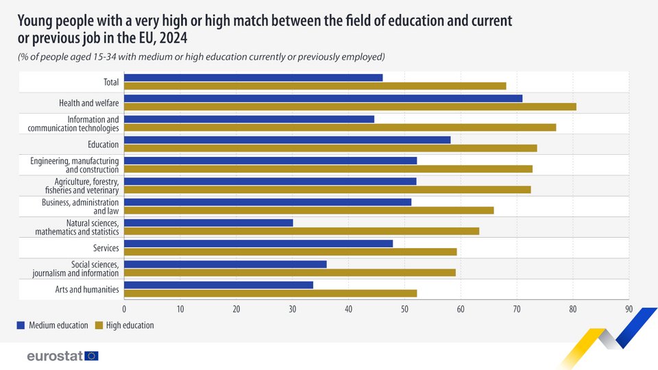 Συγκεκριμένα, σύμφωνα με τα στοιχεία της Eurostat, το 2024, το 56,4% των νέων ηλικίας 15-34 ετών στην ΕΕ με μεσαίο ή υψηλότερο επίπεδο εκπαίδευσης ανέφεραν πολύ υψηλή ή υψηλή αντιστοίχιση μεταξύ του αντικειμένου της εκπαίδευσης και της εργασίας τους.