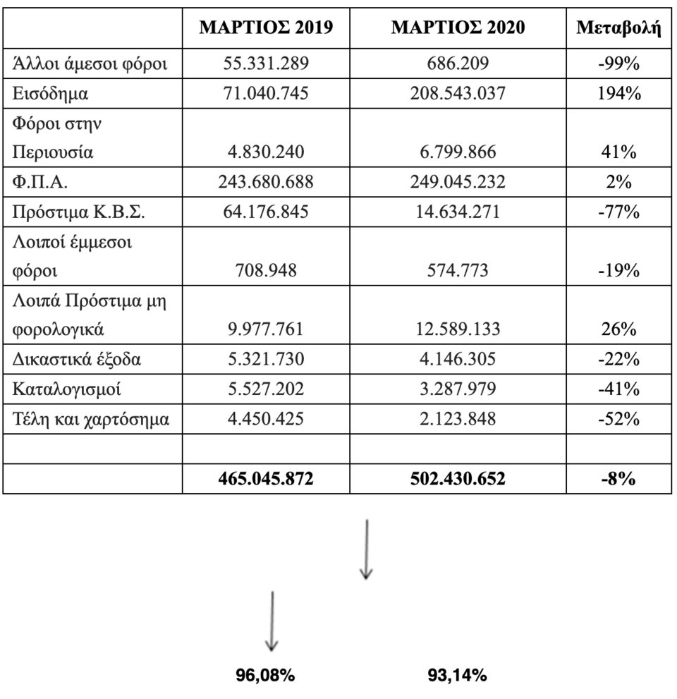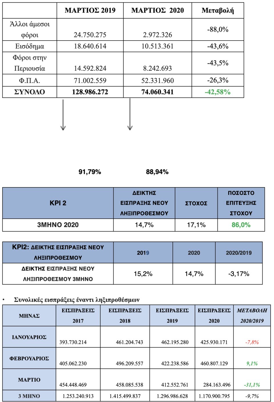 Σε ό,τι αφορά τις εισπράξεις έναντι νέου ληξιπροθέσμου για το Μάρτιο (εξαιρουμένων των μη φορολογικών κατηγοριών), έφτασαν τα 82 εκ. (έναντι 138 εκ. την αντίστοιχη περίοδο του 2019) εκ των οποίων το μεγαλύτερο ποσοστό (92%) οφείλεται στις παρακάτω κατηγορίες φόρων: