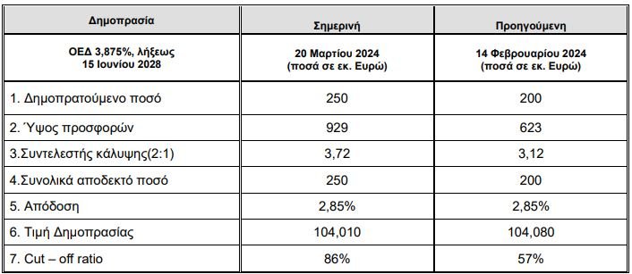 «Σήμερα διενεργήθηκε επανέκδοση μέσω δημοπρασίας Ελληνικών τίτλων 3,875%, λήξεως 15 Ιουνίου 2028, ύψους 250 εκατομμυρίων ευρώ. Η δημοπρασία πραγματοποιήθηκε μέσω των Βασικών Διαπραγματευτών Αγοράς (Primary Dealers). Οι συνολικές προσφορές ανήλθαν σε 929 εκατ. ευρώ και η ημερομηνία διακανονισμού είναι η Τετάρτη 27 Μαρτίου 2024».