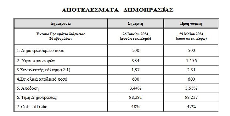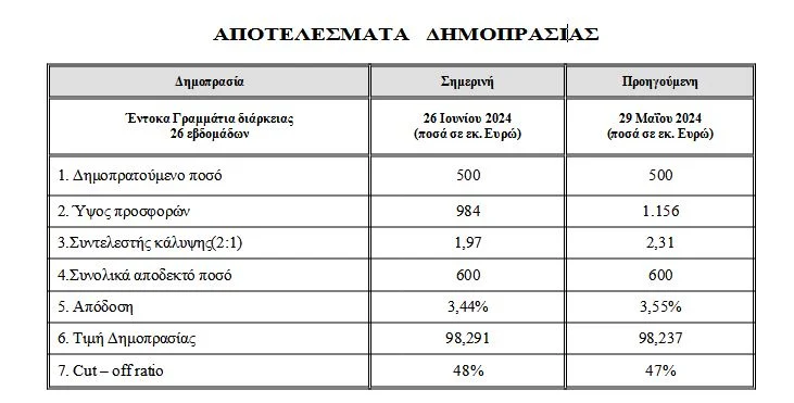 Διενεργήθηκε σήμερα 26 Ιουνίου δημοπρασία εντόκων γραμματίων διάρκειας 26 εβδομάδων, ύψους 500 εκατομμυρίων Ευρώ από τον ΟΔΔΗΧ.
