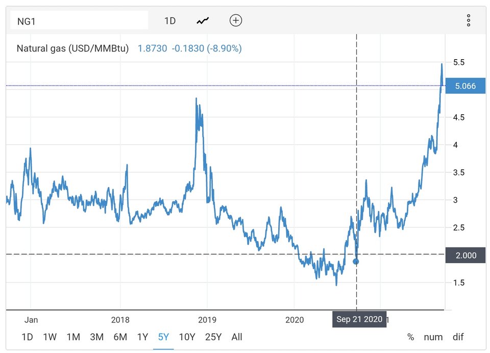 Σύμφωνα με την Trading Economics, η τιμή του φυσικού αερίου θα διατηρηθεί λίγο πιο κάτω από τα 5 δολάρια/ ΜΜBtu ως το τέλος της χρονιάς κι εν συνεχεία θα υποχωρήσει ελαφρά, στα 4,16 δολάρια, ως τον Ιούλιο του 2022. Αυτό σημαίνει, όμως, πολύ απλά ότι θα διατηρηθεί σε διπλάσια επίπεδα από τα 2 δολάρια του Φθινοπώρου του 2020.