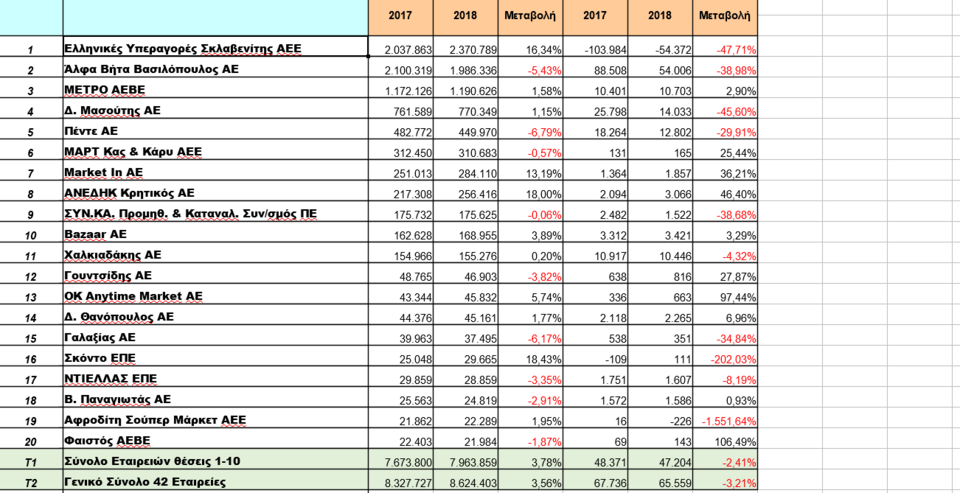 Τα καθαρά αποτελέσματα το 2018 εμφανίζονται λίγο μειωμένα, κατά 3,21% ή κατά 2,18 εκατ. ευρώ, από 67,74 εκατ. ευρώ το 2017 σε 65,60 εκατ. ευρώ, ενώ το καθαρό περιθώριο κέρδους διαμορφώθηκε το 2018 σε 0,76%, έναντι 0,81% το 2017. Συνολικά, το 2018 καταγράφεται, μέσα από τις σελίδες των ισολογισμών, ως μία σταθεροποιητική χρονιά χωρίς έντονες μεταβολές για τον κλάδο.