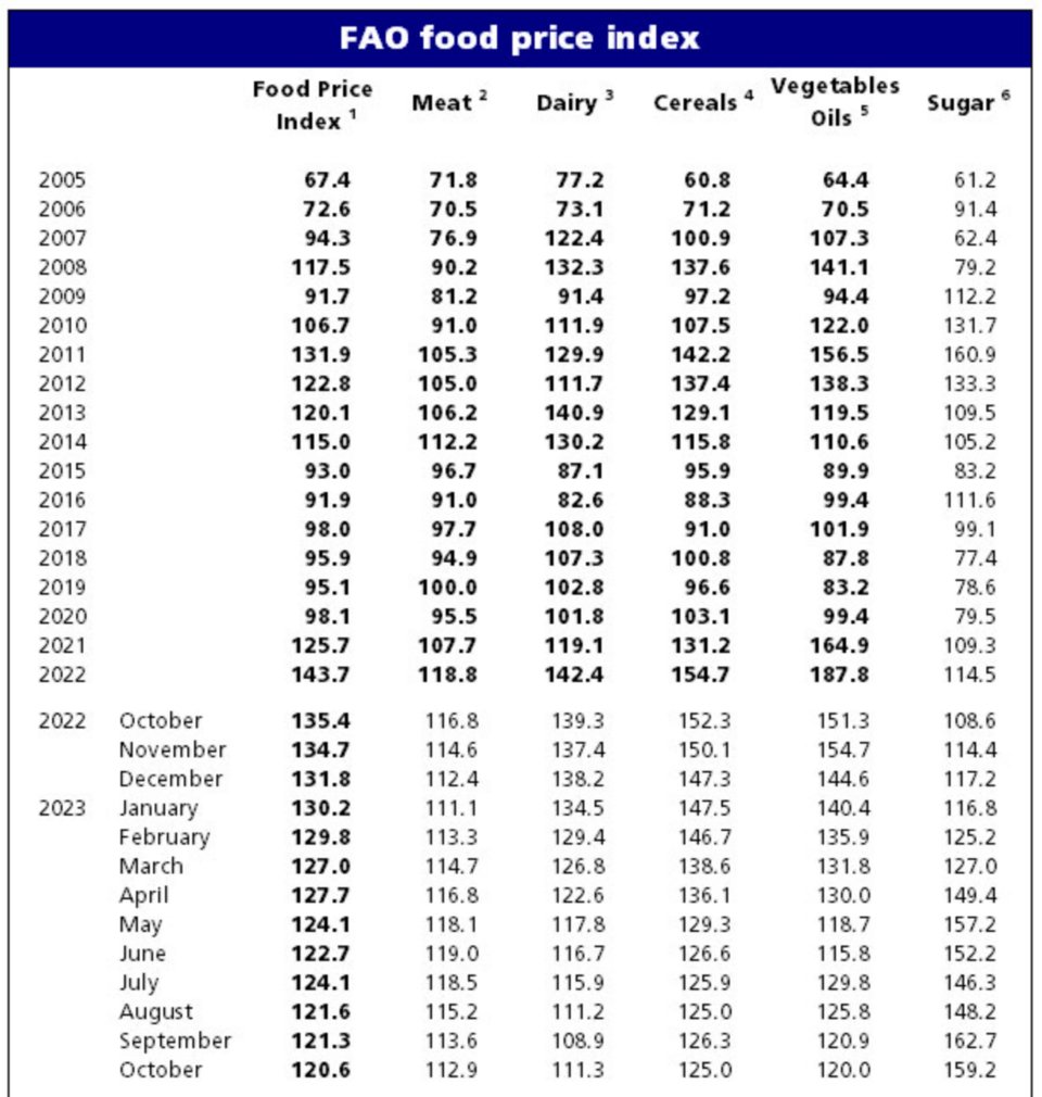 Τα καλά ή έστω ενθαρρυντικά νέα έρχονται αυτήν τη φορά από το Δείκτη Τιμών Τροφίμων του FAO, ο οποίος μειώθηκε για τρίτο συνεχή μήνα τον Οκτώβριο και πλέον βρίσκεται 10,9% χαμηλότερα από τα περσινά επίπεδα.