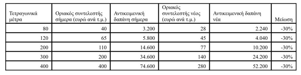 Πλέον, οι ανωτέρω συντελεστές είναι μειωμένοι σε 30% και 58% αντίστοιχα έτσι ώστε σε αυτές τις περιοχές η αντικειμενική δαπάνη να μειωθεί κατά 35%: